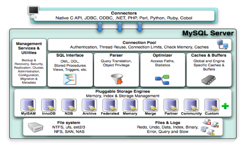 - Management Serveices & Utilities:系统管理和控制工具,备份、安全、复制、集群等