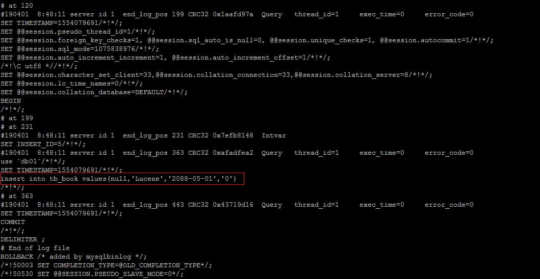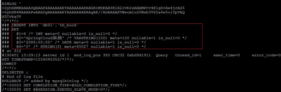 查看日志内容:日志格式 ROW,直接查看数据是乱码,可以在 mysqlbinlog 后面加上参数 -vv